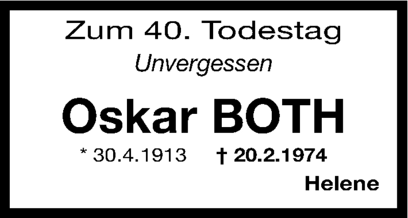 Hier finden Sie alle Traueranzeigen aus der Zeitung, die bisher für Oskar Both erschienen sind. Weitere Traueranzeigen, die in der Zeitung erscheinen, werden hier ebenfalls aufgelistet