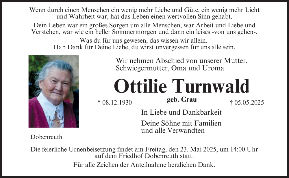 Hier finden Sie alle Traueranzeigen aus der Zeitung, die bisher für Ottilie Turnwald erschienen sind. Weitere Traueranzeigen, die in der Zeitung erscheinen, werden hier ebenfalls aufgelistet