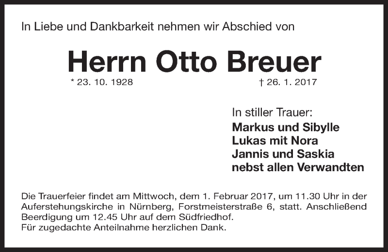 Hier finden Sie alle Traueranzeigen aus der Zeitung, die bisher für Otto Breuer erschienen sind. Weitere Traueranzeigen, die in der Zeitung erscheinen, werden hier ebenfalls aufgelistet
