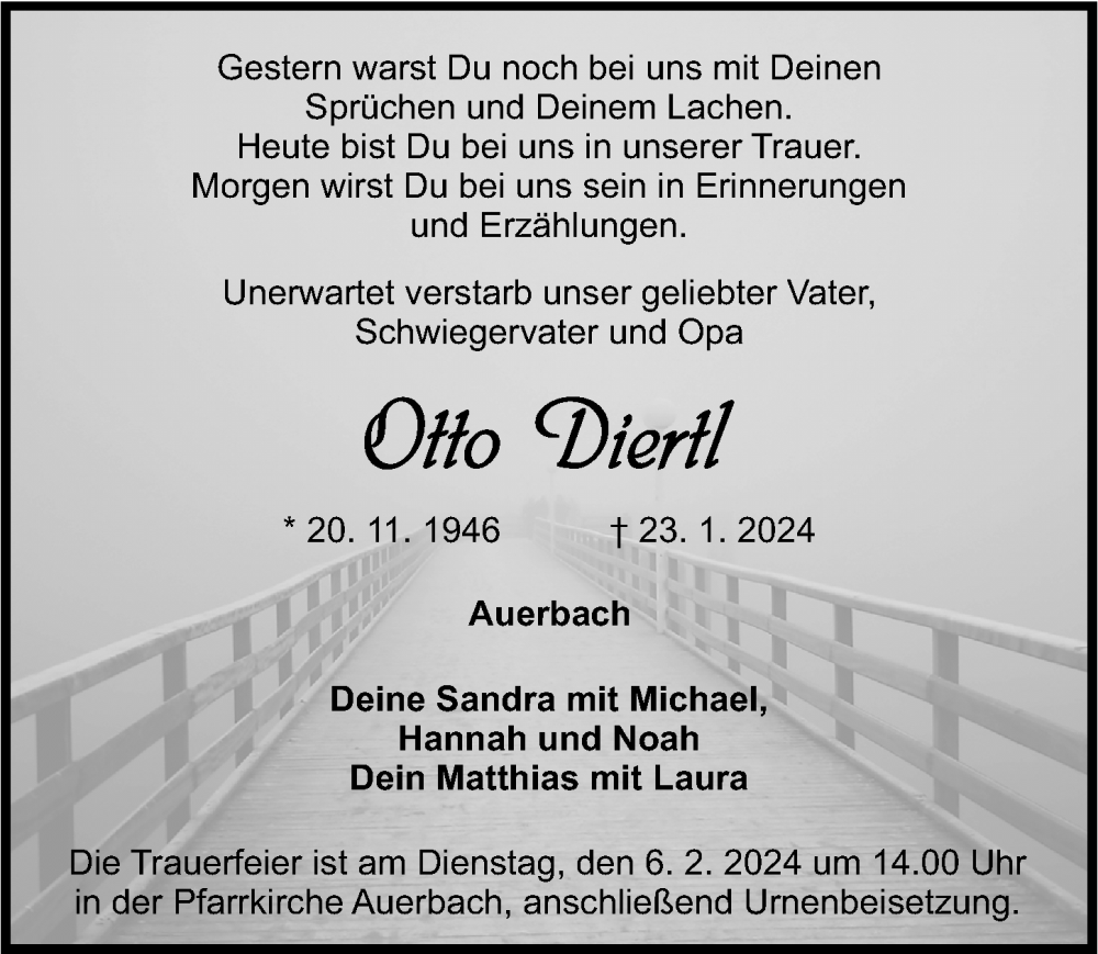 Hier finden Sie alle Traueranzeigen aus der Zeitung, die bisher für Otto Diertl erschienen sind. Weitere Traueranzeigen, die in der Zeitung erscheinen, werden hier ebenfalls aufgelistet