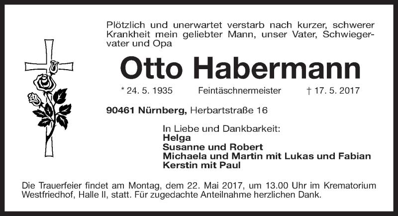 Hier finden Sie alle Traueranzeigen aus der Zeitung, die bisher für Otto Habermann erschienen sind. Weitere Traueranzeigen, die in der Zeitung erscheinen, werden hier ebenfalls aufgelistet