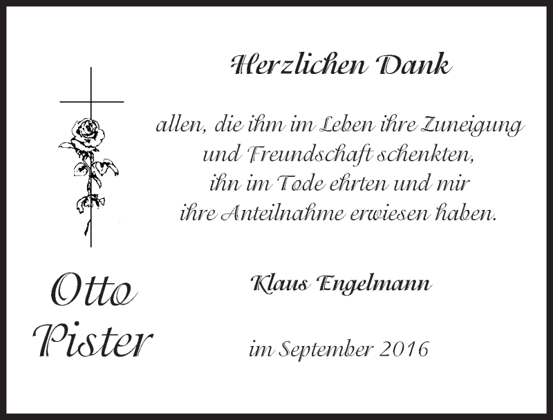 Hier finden Sie alle Traueranzeigen aus der Zeitung, die bisher für Otto Pister erschienen sind. Weitere Traueranzeigen, die in der Zeitung erscheinen, werden hier ebenfalls aufgelistet