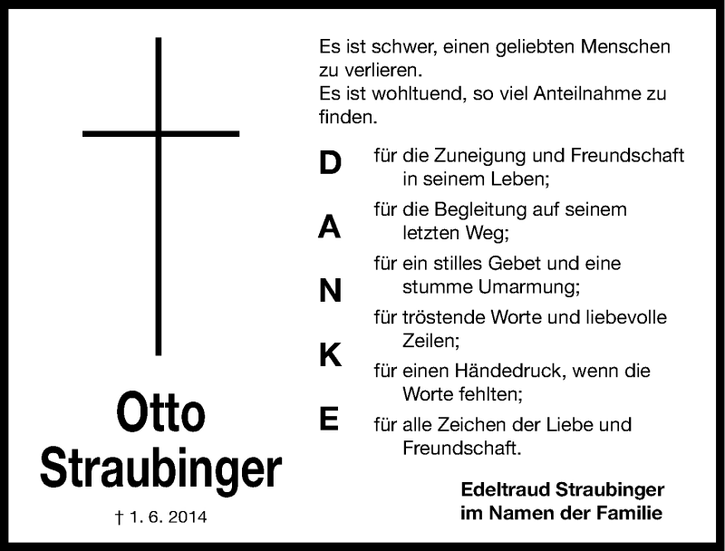 Hier finden Sie alle Traueranzeigen aus der Zeitung, die bisher für Otto Straubinger erschienen sind. Weitere Traueranzeigen, die in der Zeitung erscheinen, werden hier ebenfalls aufgelistet