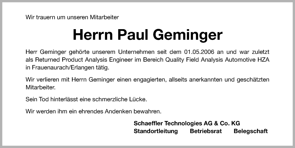 Hier finden Sie alle Traueranzeigen aus der Zeitung, die bisher für Paul Geminger erschienen sind. Weitere Traueranzeigen, die in der Zeitung erscheinen, werden hier ebenfalls aufgelistet