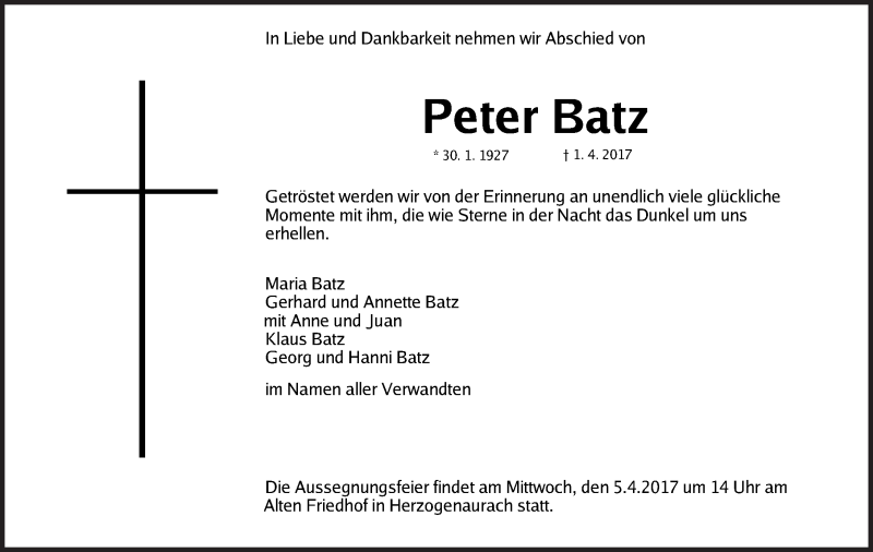 Hier finden Sie alle Traueranzeigen aus der Zeitung, die bisher für Peter Batz erschienen sind. Weitere Traueranzeigen, die in der Zeitung erscheinen, werden hier ebenfalls aufgelistet