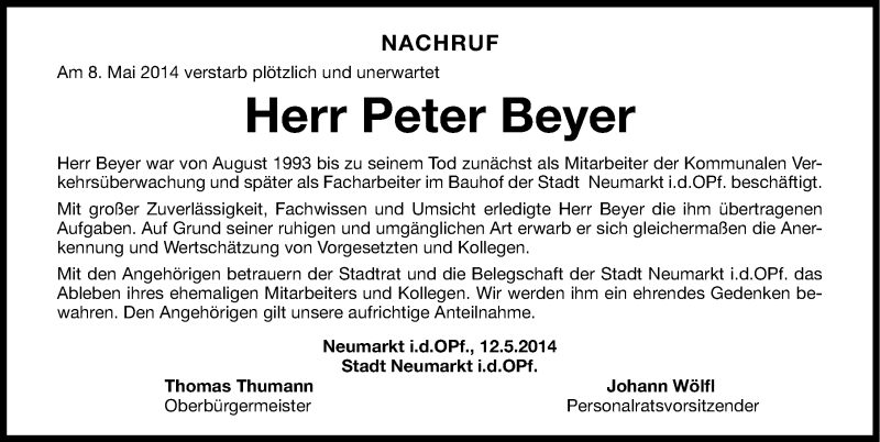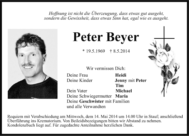 Hier finden Sie alle Traueranzeigen aus der Zeitung, die bisher für Peter Beyer erschienen sind. Weitere Traueranzeigen, die in der Zeitung erscheinen, werden hier ebenfalls aufgelistet