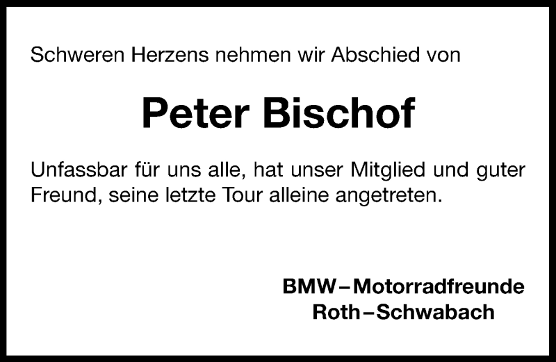 Hier finden Sie alle Traueranzeigen aus der Zeitung, die bisher für Peter Bischof erschienen sind. Weitere Traueranzeigen, die in der Zeitung erscheinen, werden hier ebenfalls aufgelistet
