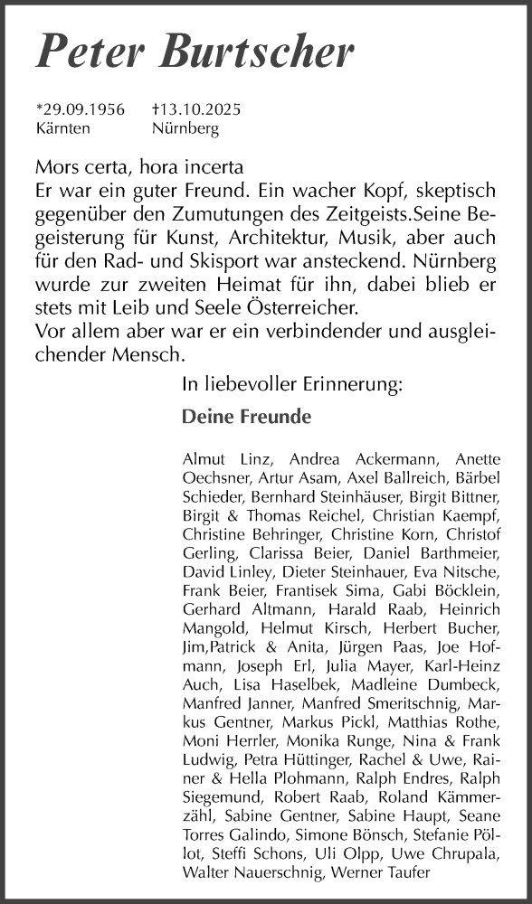 Hier finden Sie alle Traueranzeigen aus der Zeitung, die bisher für Peter Burtscher erschienen sind. Weitere Traueranzeigen, die in der Zeitung erscheinen, werden hier ebenfalls aufgelistet