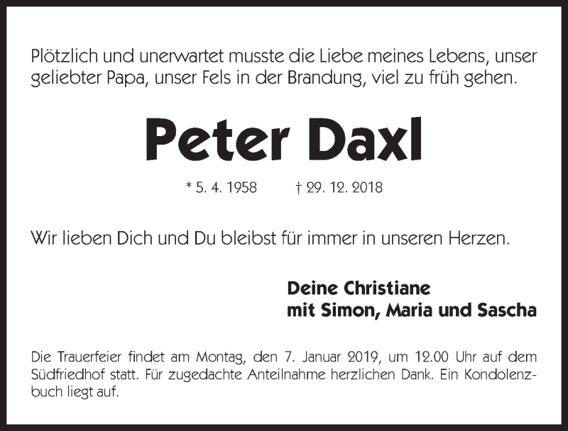 Hier finden Sie alle Traueranzeigen aus der Zeitung, die bisher für Peter Daxl erschienen sind. Weitere Traueranzeigen, die in der Zeitung erscheinen, werden hier ebenfalls aufgelistet