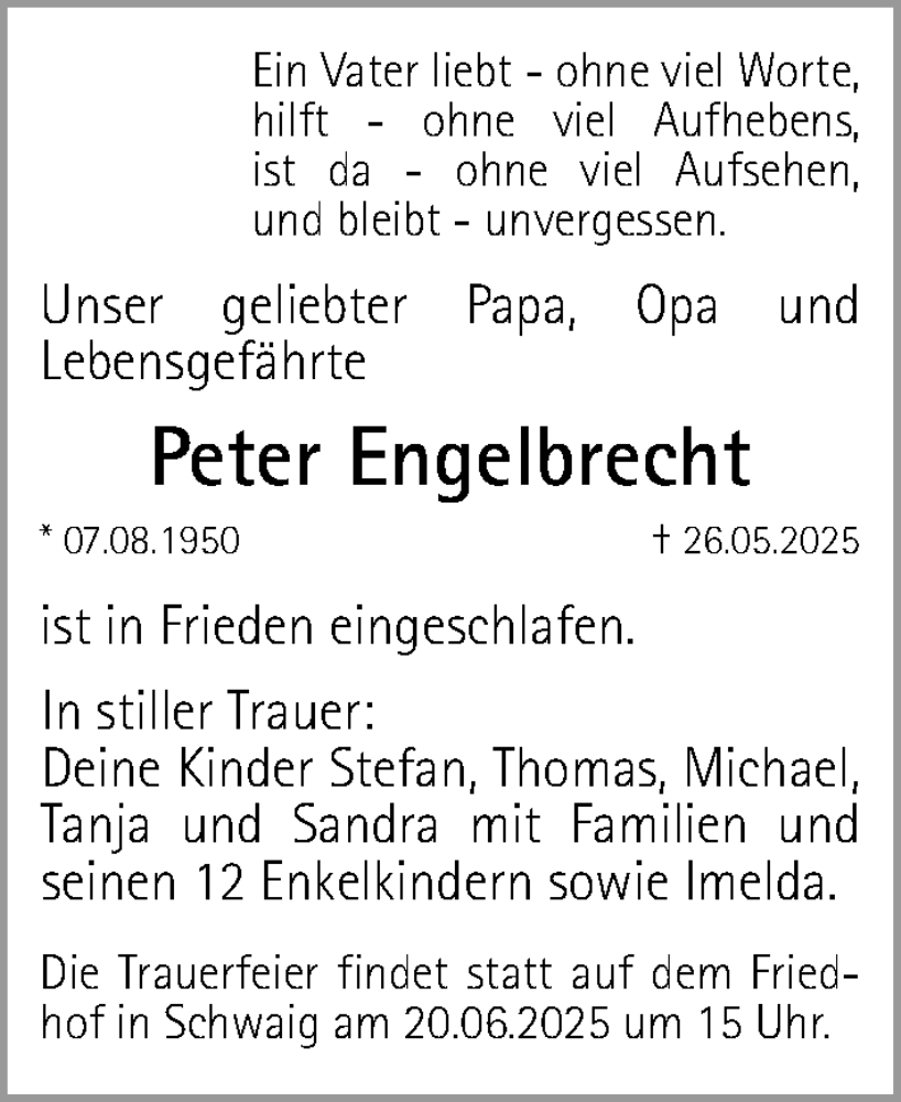 Hier finden Sie alle Traueranzeigen aus der Zeitung, die bisher für Peter Engelbrecht erschienen sind. Weitere Traueranzeigen, die in der Zeitung erscheinen, werden hier ebenfalls aufgelistet