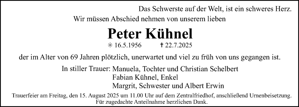 Hier finden Sie alle Traueranzeigen aus der Zeitung, die bisher für Peter Kühnel erschienen sind. Weitere Traueranzeigen, die in der Zeitung erscheinen, werden hier ebenfalls aufgelistet