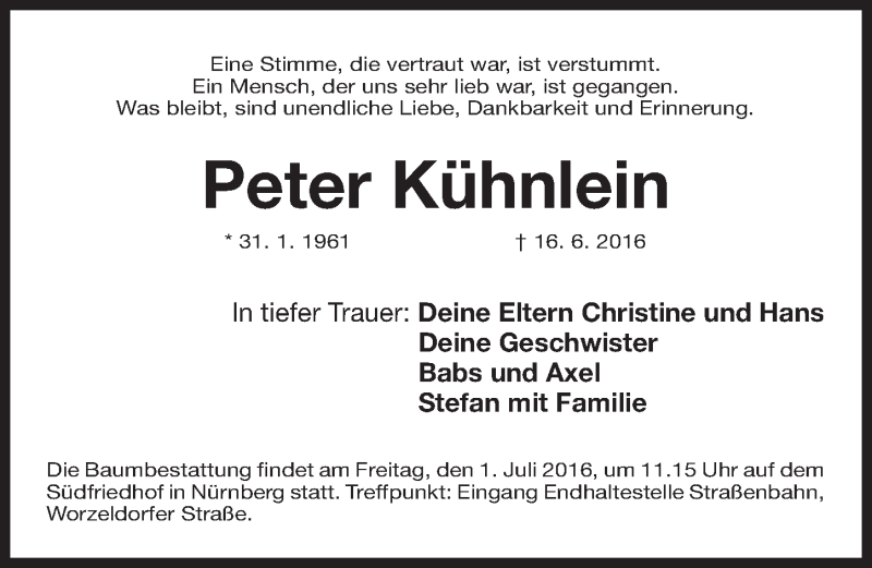 Hier finden Sie alle Traueranzeigen aus der Zeitung, die bisher für Peter Kühnlein erschienen sind. Weitere Traueranzeigen, die in der Zeitung erscheinen, werden hier ebenfalls aufgelistet