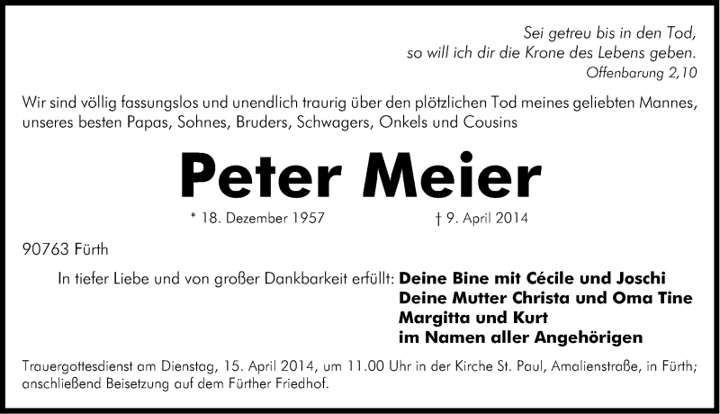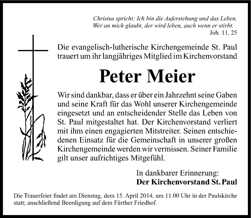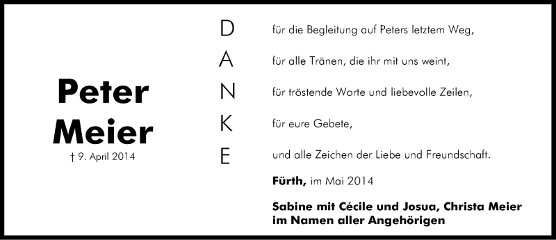 Hier finden Sie alle Traueranzeigen aus der Zeitung, die bisher für Peter Meier erschienen sind. Weitere Traueranzeigen, die in der Zeitung erscheinen, werden hier ebenfalls aufgelistet