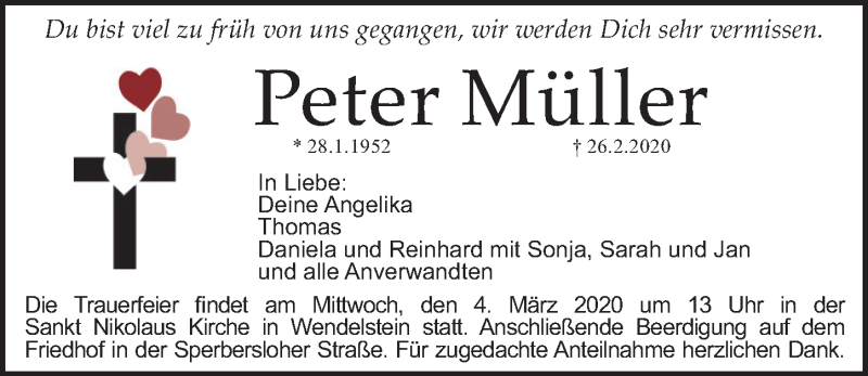 Hier finden Sie alle Traueranzeigen aus der Zeitung, die bisher für Peter Müller erschienen sind. Weitere Traueranzeigen, die in der Zeitung erscheinen, werden hier ebenfalls aufgelistet