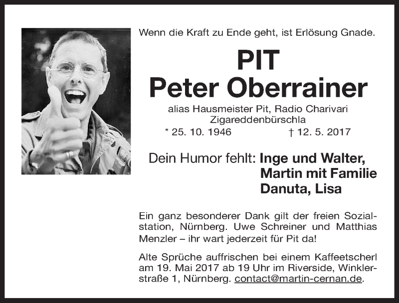 Hier finden Sie alle Traueranzeigen aus der Zeitung, die bisher für Peter Oberrainer erschienen sind. Weitere Traueranzeigen, die in der Zeitung erscheinen, werden hier ebenfalls aufgelistet
