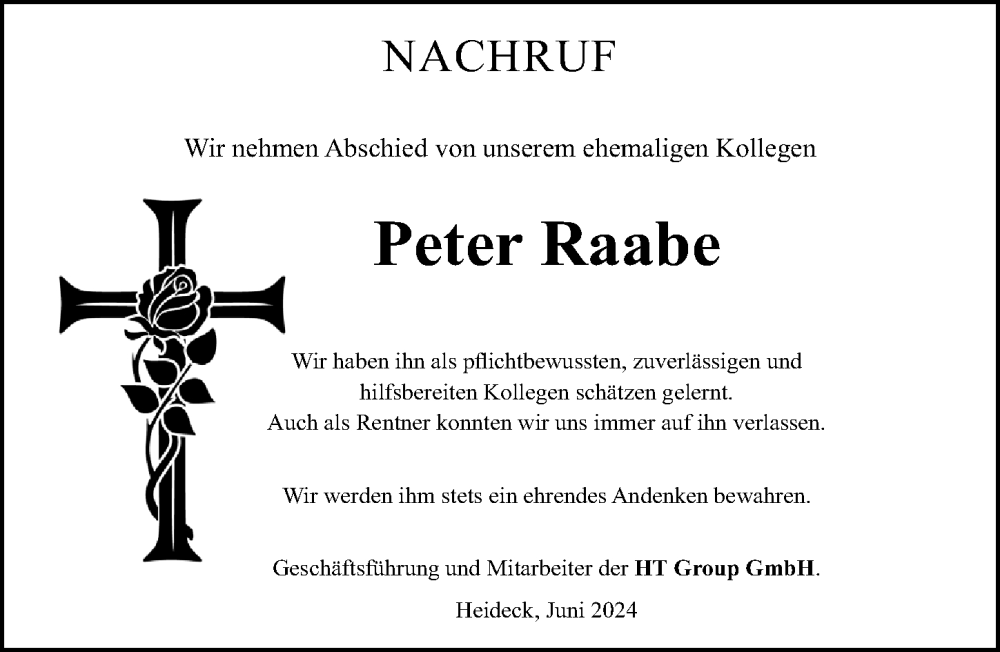 Hier finden Sie alle Traueranzeigen aus der Zeitung, die bisher für Peter Raabe erschienen sind. Weitere Traueranzeigen, die in der Zeitung erscheinen, werden hier ebenfalls aufgelistet