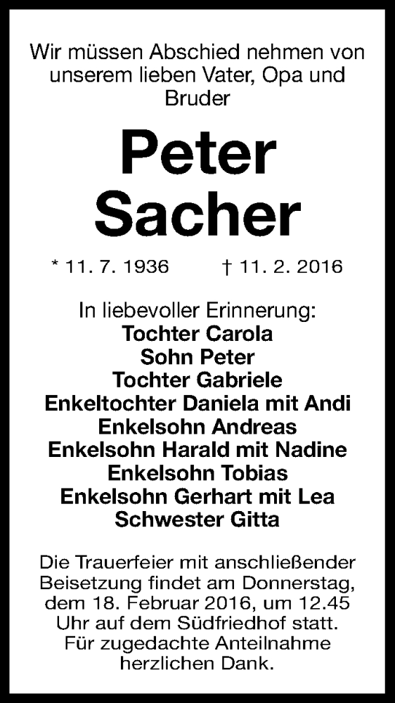 Hier finden Sie alle Traueranzeigen aus der Zeitung, die bisher für Peter Sacher erschienen sind. Weitere Traueranzeigen, die in der Zeitung erscheinen, werden hier ebenfalls aufgelistet