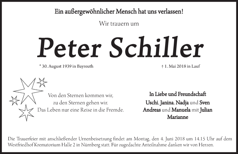 Hier finden Sie alle Traueranzeigen aus der Zeitung, die bisher für Peter Schiller erschienen sind. Weitere Traueranzeigen, die in der Zeitung erscheinen, werden hier ebenfalls aufgelistet