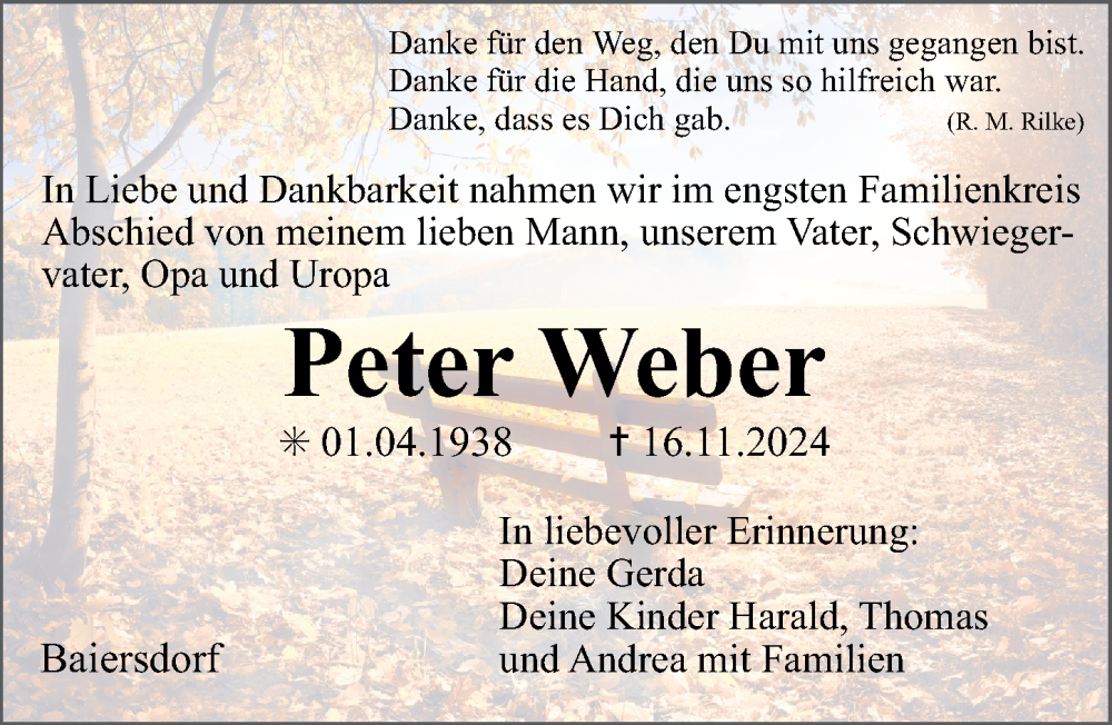 Hier finden Sie alle Traueranzeigen aus der Zeitung, die bisher für Peter Weber erschienen sind. Weitere Traueranzeigen, die in der Zeitung erscheinen, werden hier ebenfalls aufgelistet