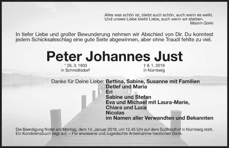 Hier finden Sie alle Traueranzeigen aus der Zeitung, die bisher für Peter Johannes Just erschienen sind. Weitere Traueranzeigen, die in der Zeitung erscheinen, werden hier ebenfalls aufgelistet