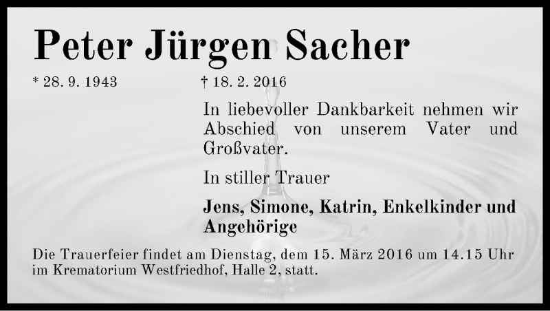 Hier finden Sie alle Traueranzeigen aus der Zeitung, die bisher für Peter Jürgen Sacher erschienen sind. Weitere Traueranzeigen, die in der Zeitung erscheinen, werden hier ebenfalls aufgelistet