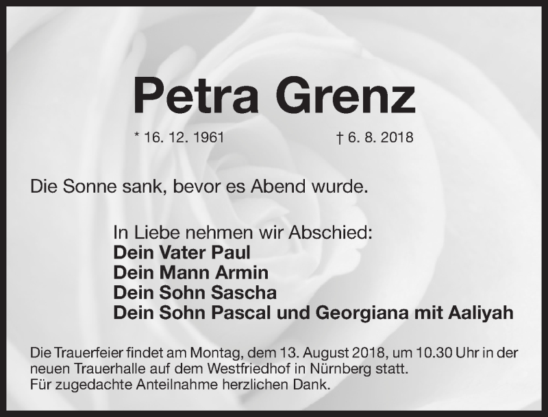 Hier finden Sie alle Traueranzeigen aus der Zeitung, die bisher für Petra Grenz erschienen sind. Weitere Traueranzeigen, die in der Zeitung erscheinen, werden hier ebenfalls aufgelistet