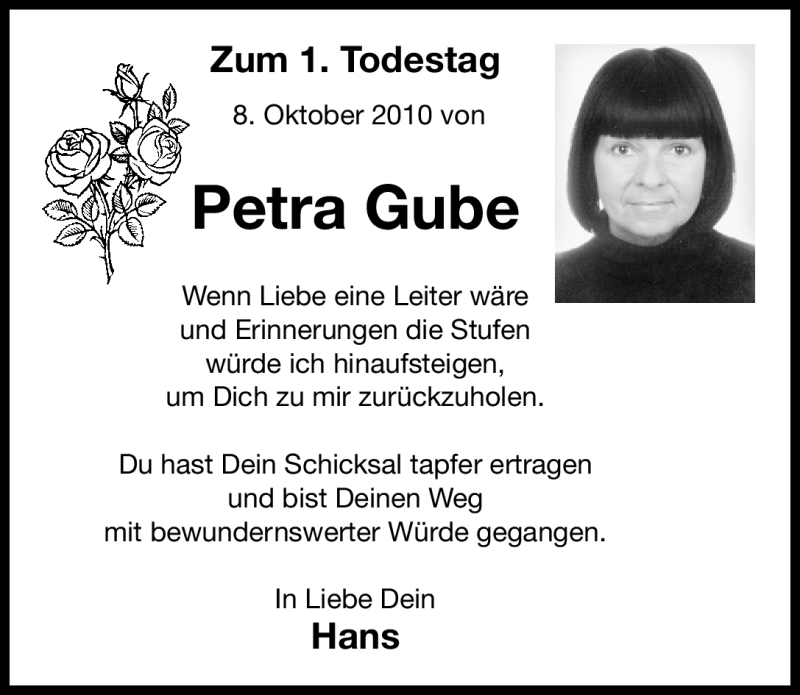 Hier finden Sie alle Traueranzeigen aus der Zeitung, die bisher für Petra Gube erschienen sind. Weitere Traueranzeigen, die in der Zeitung erscheinen, werden hier ebenfalls aufgelistet