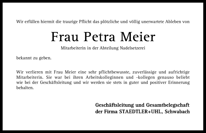 Hier finden Sie alle Traueranzeigen aus der Zeitung, die bisher für Petra Meier erschienen sind. Weitere Traueranzeigen, die in der Zeitung erscheinen, werden hier ebenfalls aufgelistet