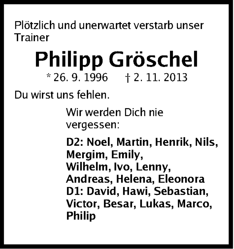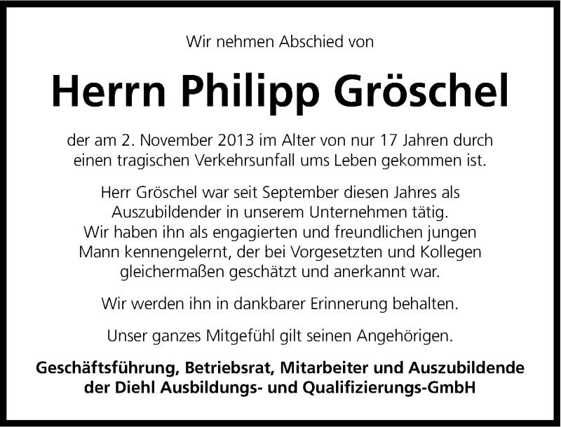 Hier finden Sie alle Traueranzeigen aus der Zeitung, die bisher für Philipp Gröschel erschienen sind. Weitere Traueranzeigen, die in der Zeitung erscheinen, werden hier ebenfalls aufgelistet