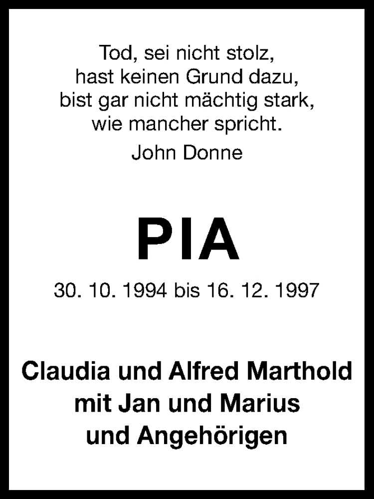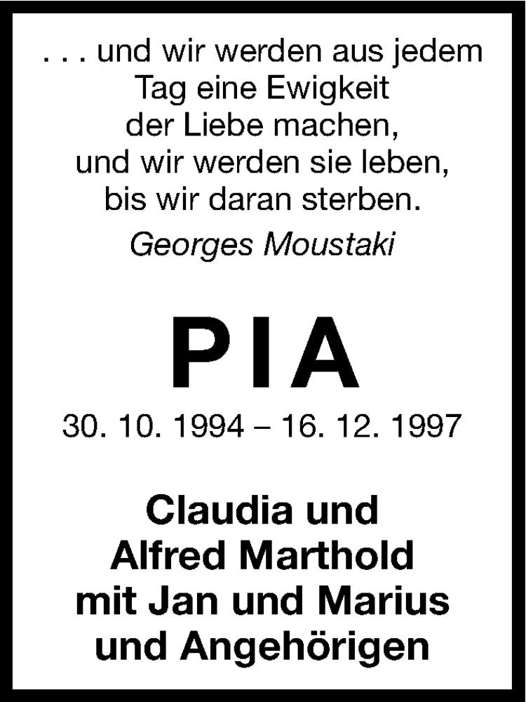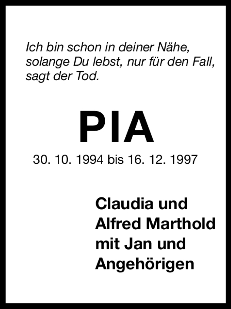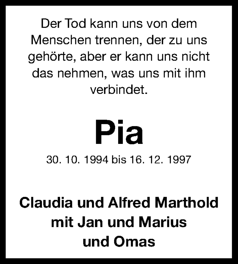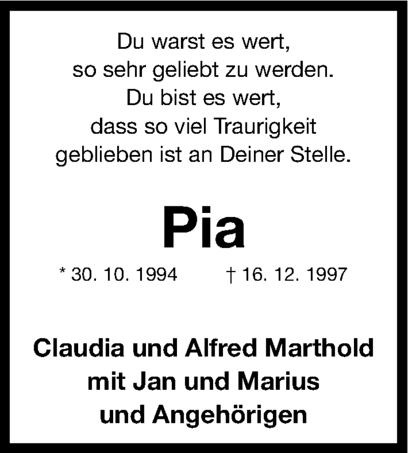 Hier finden Sie alle Traueranzeigen aus der Zeitung, die bisher für Pia erschienen sind. Weitere Traueranzeigen, die in der Zeitung erscheinen, werden hier ebenfalls aufgelistet