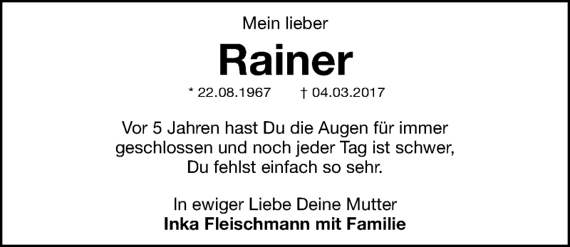 Hier finden Sie alle Traueranzeigen aus der Zeitung, die bisher für Rainer Fleischmann erschienen sind. Weitere Traueranzeigen, die in der Zeitung erscheinen, werden hier ebenfalls aufgelistet