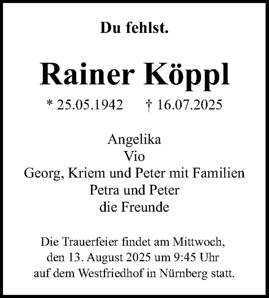 Hier finden Sie alle Traueranzeigen aus der Zeitung, die bisher für Rainer Köppl erschienen sind. Weitere Traueranzeigen, die in der Zeitung erscheinen, werden hier ebenfalls aufgelistet