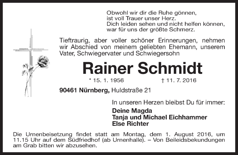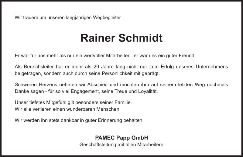 Hier finden Sie alle Traueranzeigen aus der Zeitung, die bisher für Rainer Schmidt erschienen sind. Weitere Traueranzeigen, die in der Zeitung erscheinen, werden hier ebenfalls aufgelistet