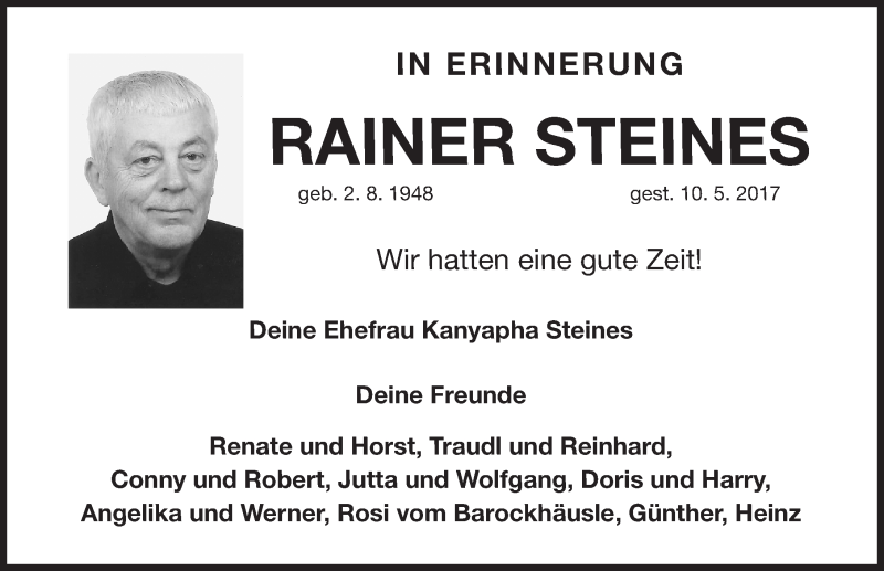 Hier finden Sie alle Traueranzeigen aus der Zeitung, die bisher für Rainer Steines erschienen sind. Weitere Traueranzeigen, die in der Zeitung erscheinen, werden hier ebenfalls aufgelistet