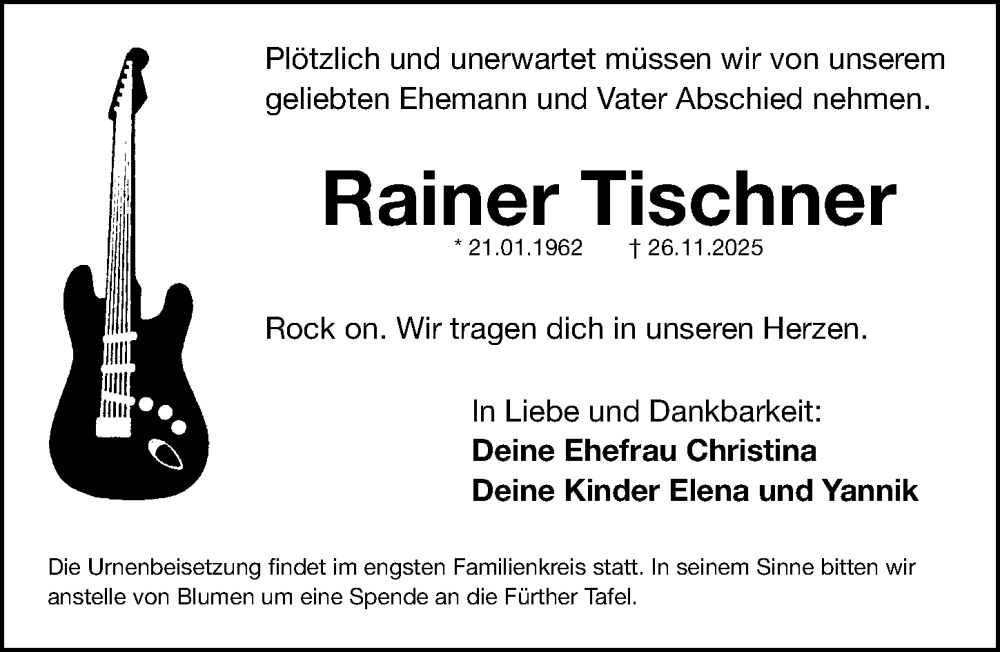 Hier finden Sie alle Traueranzeigen aus der Zeitung, die bisher für Rainer Tischner erschienen sind. Weitere Traueranzeigen, die in der Zeitung erscheinen, werden hier ebenfalls aufgelistet