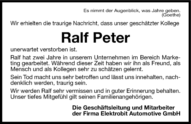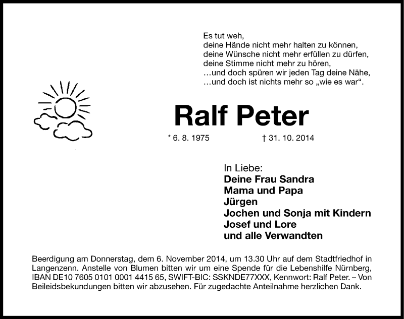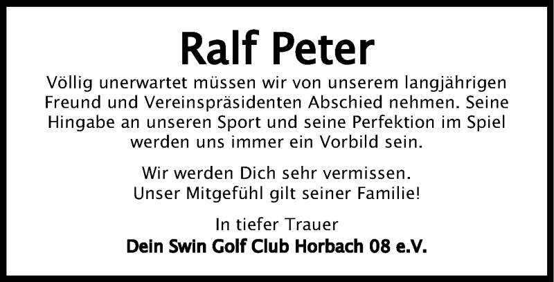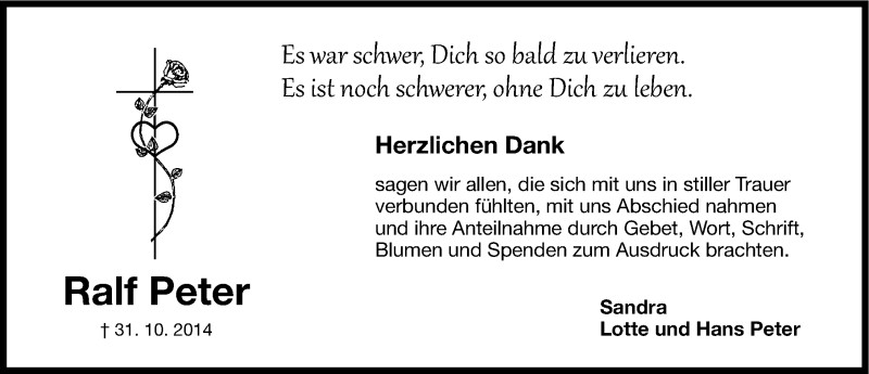 Hier finden Sie alle Traueranzeigen aus der Zeitung, die bisher für Ralf Peter erschienen sind. Weitere Traueranzeigen, die in der Zeitung erscheinen, werden hier ebenfalls aufgelistet