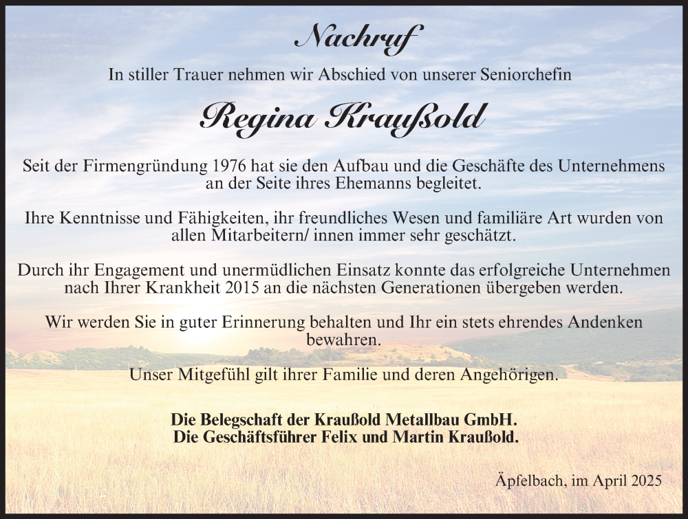 Hier finden Sie alle Traueranzeigen aus der Zeitung, die bisher für Regina Kraußold erschienen sind. Weitere Traueranzeigen, die in der Zeitung erscheinen, werden hier ebenfalls aufgelistet