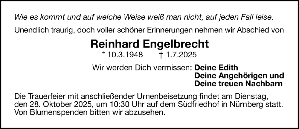 Hier finden Sie alle Traueranzeigen aus der Zeitung, die bisher für Reinhard Engelbrecht erschienen sind. Weitere Traueranzeigen, die in der Zeitung erscheinen, werden hier ebenfalls aufgelistet