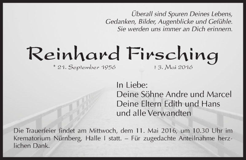 Hier finden Sie alle Traueranzeigen aus der Zeitung, die bisher für Reinhard Firsching erschienen sind. Weitere Traueranzeigen, die in der Zeitung erscheinen, werden hier ebenfalls aufgelistet