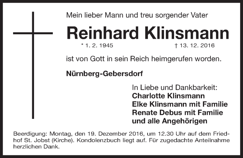Hier finden Sie alle Traueranzeigen aus der Zeitung, die bisher für Reinhard Klinsmann erschienen sind. Weitere Traueranzeigen, die in der Zeitung erscheinen, werden hier ebenfalls aufgelistet