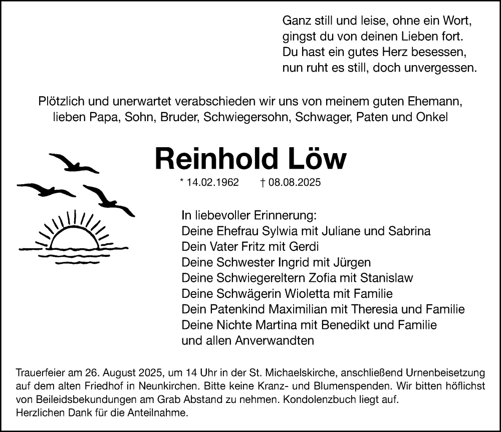 Hier finden Sie alle Traueranzeigen aus der Zeitung, die bisher für Reinhold Löw erschienen sind. Weitere Traueranzeigen, die in der Zeitung erscheinen, werden hier ebenfalls aufgelistet