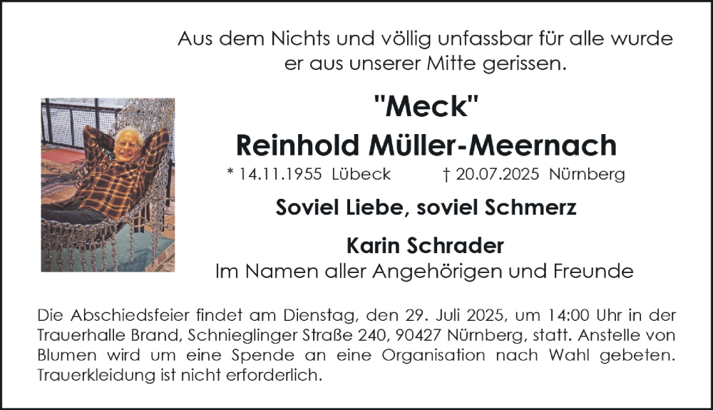 Hier finden Sie alle Traueranzeigen aus der Zeitung, die bisher für Reinhold Müller-Meernach erschienen sind. Weitere Traueranzeigen, die in der Zeitung erscheinen, werden hier ebenfalls aufgelistet