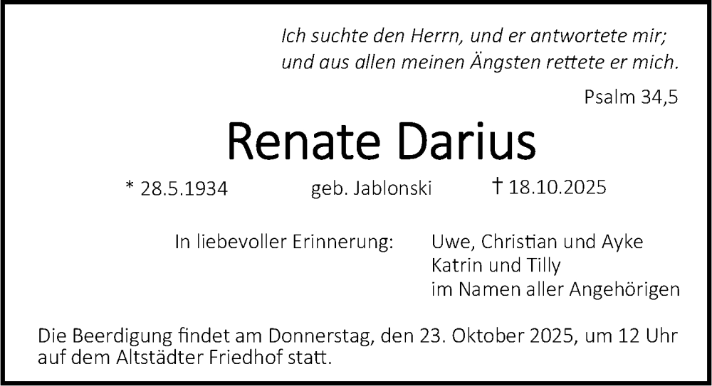 Hier finden Sie alle Traueranzeigen aus der Zeitung, die bisher für Renate Darius erschienen sind. Weitere Traueranzeigen, die in der Zeitung erscheinen, werden hier ebenfalls aufgelistet