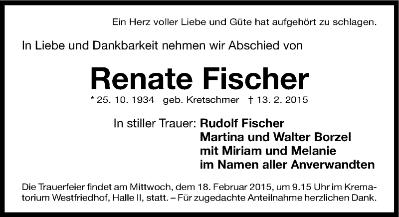 Hier finden Sie alle Traueranzeigen aus der Zeitung, die bisher für Renate Fischer erschienen sind. Weitere Traueranzeigen, die in der Zeitung erscheinen, werden hier ebenfalls aufgelistet
