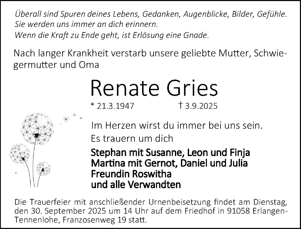 Hier finden Sie alle Traueranzeigen aus der Zeitung, die bisher für Renate Gries erschienen sind. Weitere Traueranzeigen, die in der Zeitung erscheinen, werden hier ebenfalls aufgelistet