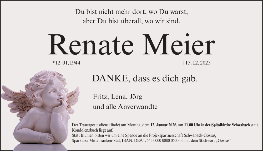 Hier finden Sie alle Traueranzeigen aus der Zeitung, die bisher für Renate Meier erschienen sind. Weitere Traueranzeigen, die in der Zeitung erscheinen, werden hier ebenfalls aufgelistet