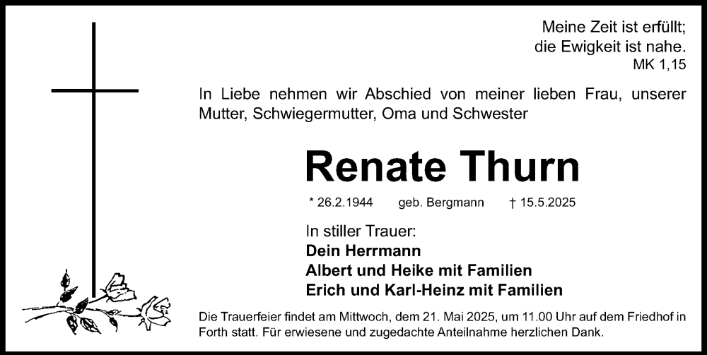 Hier finden Sie alle Traueranzeigen aus der Zeitung, die bisher für Renate Thurn erschienen sind. Weitere Traueranzeigen, die in der Zeitung erscheinen, werden hier ebenfalls aufgelistet