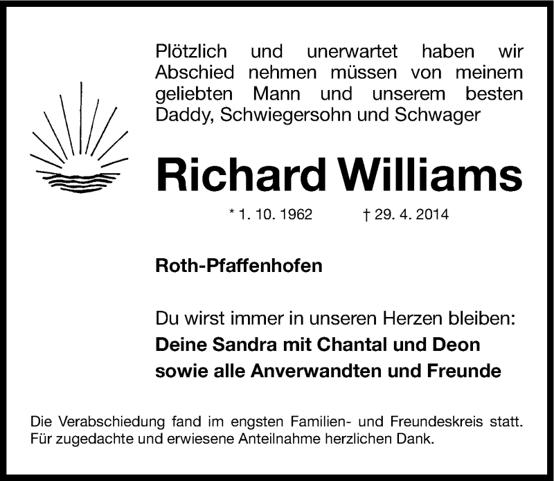Hier finden Sie alle Traueranzeigen aus der Zeitung, die bisher für Richard Williams erschienen sind. Weitere Traueranzeigen, die in der Zeitung erscheinen, werden hier ebenfalls aufgelistet