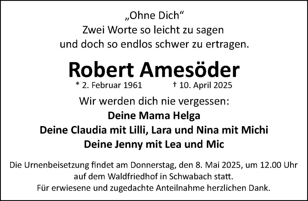 Hier finden Sie alle Traueranzeigen aus der Zeitung, die bisher für Robert Amesöder erschienen sind. Weitere Traueranzeigen, die in der Zeitung erscheinen, werden hier ebenfalls aufgelistet