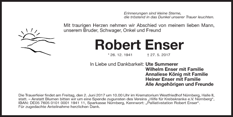 Hier finden Sie alle Traueranzeigen aus der Zeitung, die bisher für Robert Enser erschienen sind. Weitere Traueranzeigen, die in der Zeitung erscheinen, werden hier ebenfalls aufgelistet